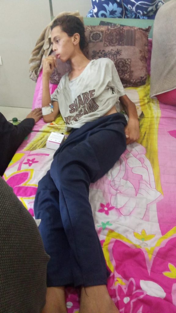 مكث 18 يومًا في مستشفى الحلو، يعيش على المحاليل فقط. كان يرفض الطعام أو لا يقدر على تناوله، وحتى الماء كنا ندخله لجسمه بالسرنجة. سوء التغذية أدى الى ضمور عضلي وفقدان الحركة، ولم يعد قادرًا على المضغ. ظهرت التقرحات على ظهره، وجسده أصبح جلدًا على عظم.
